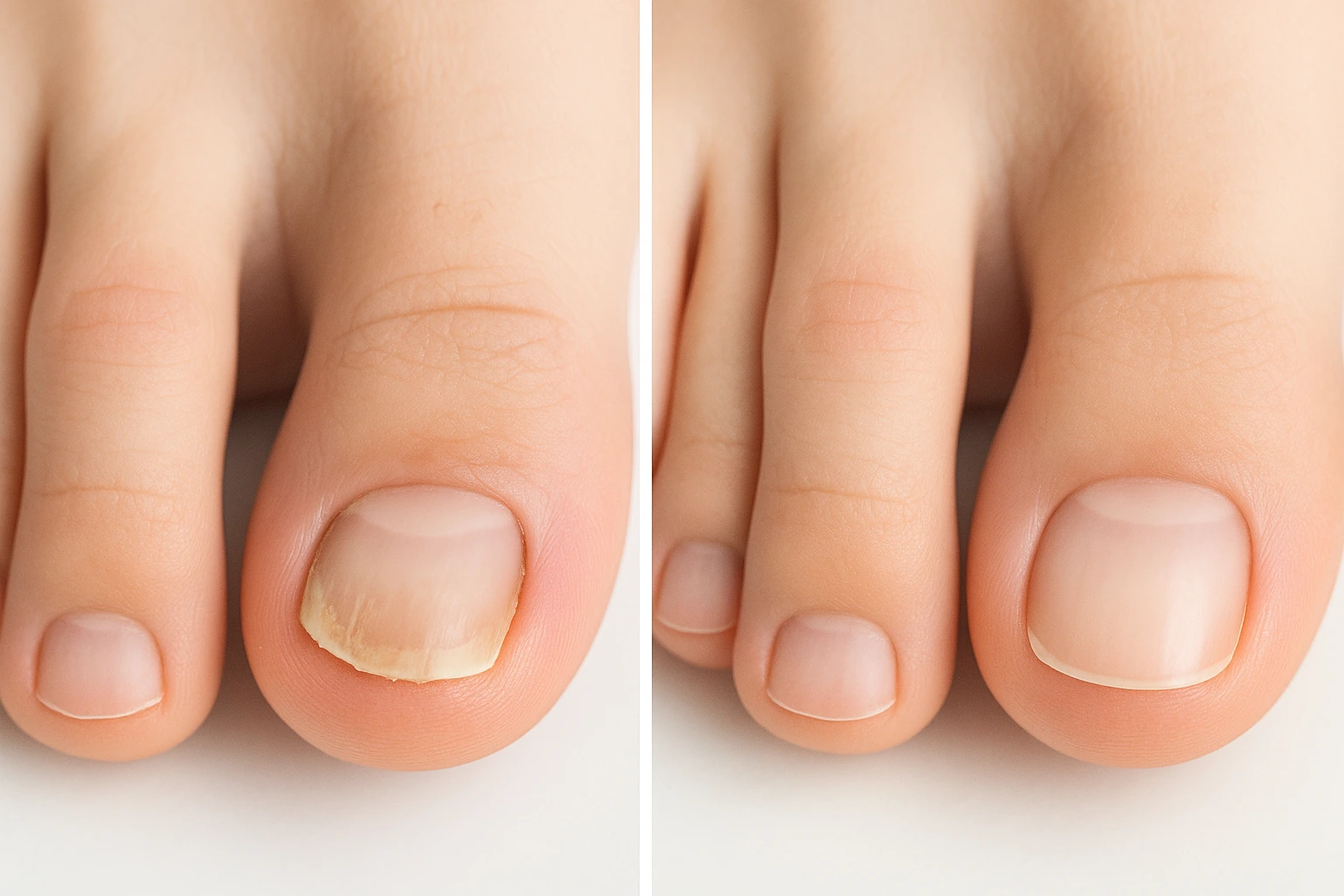 Zdjęcia przed i po rekonstrukcji paznokcia.